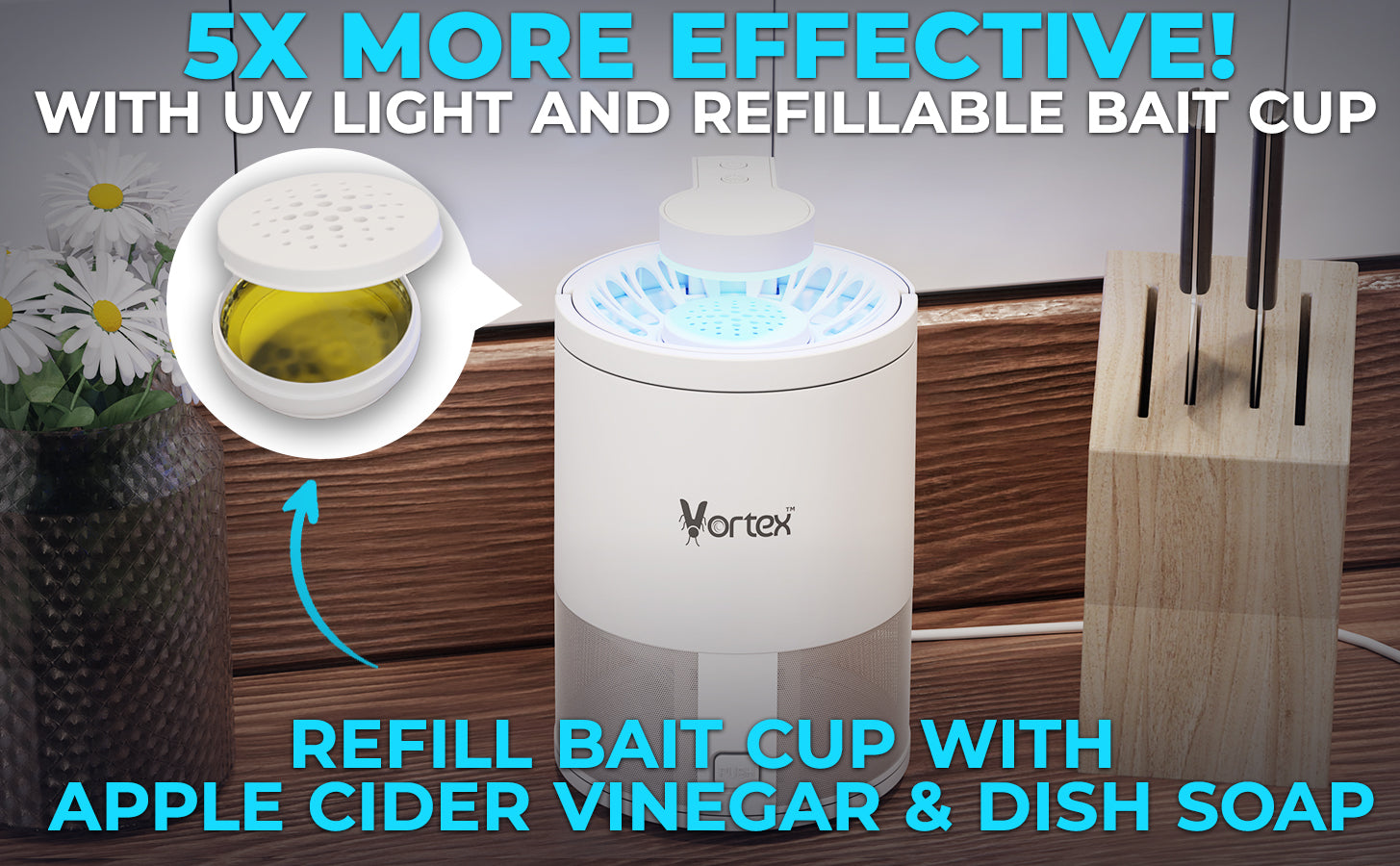 - Bait Boost: The Vortex's refillable bait cup emits a strong scent, making it 5 times more effective than other UV flycatchers. (Recommended - refill with apple cider vinegar & and dish soap)