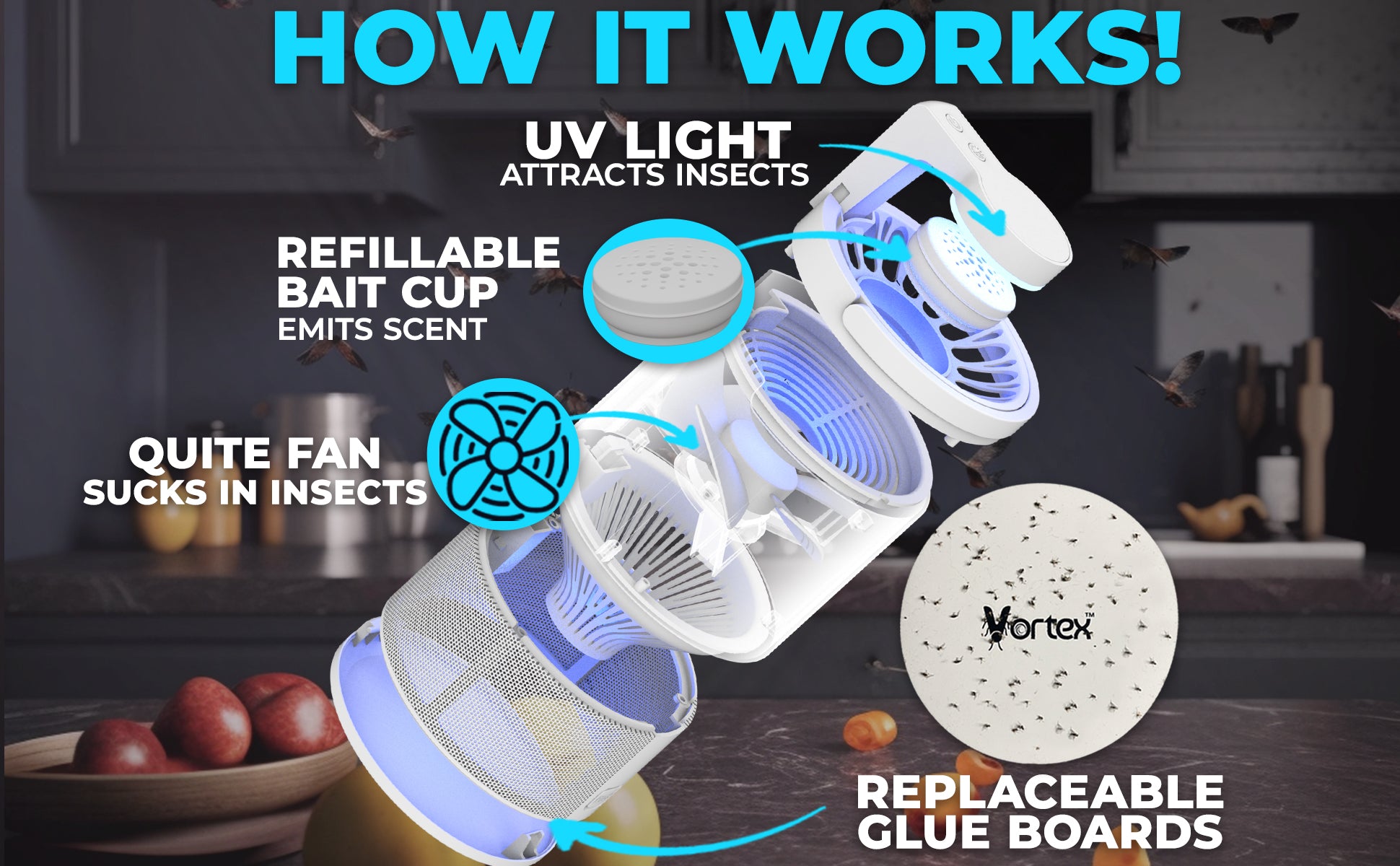 Introducing the Vortex - the ultimate weapon in the battle against pesky flying insects. Primarily designed to trap fruit flies, moths, gnats, and mosquitos, the vortex ensures your space remains pest-free. The Vortex's unique refillable bait cup emits a strong scent, making it 5 times more effective than other UV flycatchers on the market. Equipped with a state-of-the-art UV light, the Vortex lures pests towards it, maximizing the trap's effectiveness. Experience the next level of insect control today!