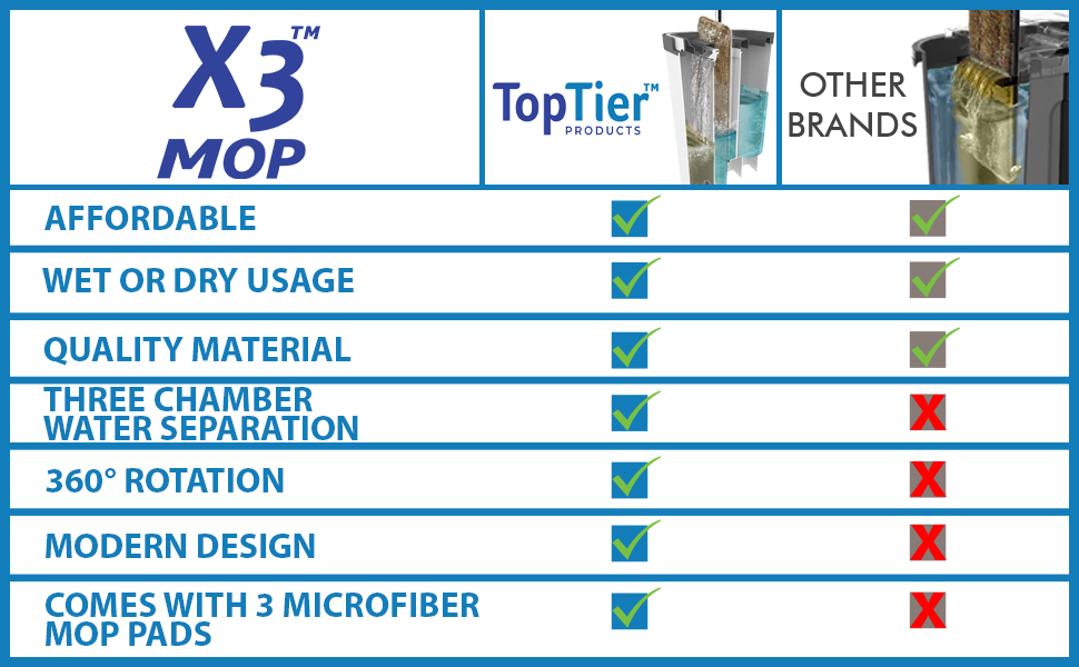 The TopTier Products X3 Mop is the perfect tool for all your cleaning needs. Our patented 3-chamber water separation technology is the industry-first to separate clean from dirty contaminated water! The stainless steel mop has 360° of head rotation for getting into those hard to reach areas. The X3 Mopping system comes with 3 (MACHINE WASHABLE) microfiber mop pads.